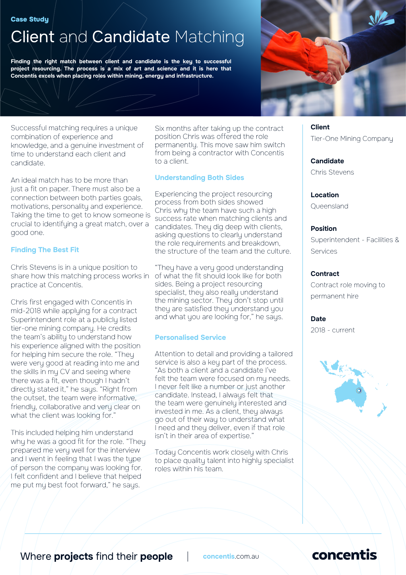 Chris first engaged with Concentis in mid-2018 while applying for a contract Superintendent role at a publicly listed tier-one mining company. He credits the team’s ability to understand how his experience aligned with the position for helping him secure the role. “They were very good at reading into me and the skills in my CV and seeing where there was a fit, even though I hadn’t directly stated it,” he says. “Right from the outset, the team were informative, friendly, collaborative and very clear on what the client was looking for.”